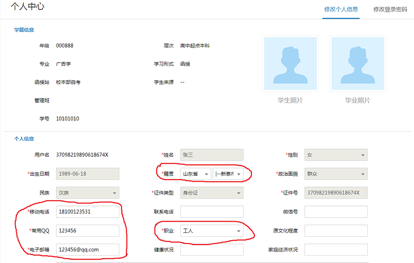 (3)在“修改个人信息”界面中核对本人信息是否正确(不可更改部分),完善个人信息(红色圈起的内容为必填内容),填写完毕“保存个人信息”。(见图3)