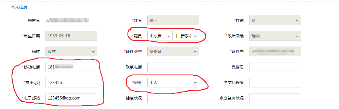 (3)在“修改个人信息”界面中核对本人信息是否正确(不可更改部分),完善个人信息(红色圈起的内容为必填内容),填写完毕“保存个人信息”。(见图3)